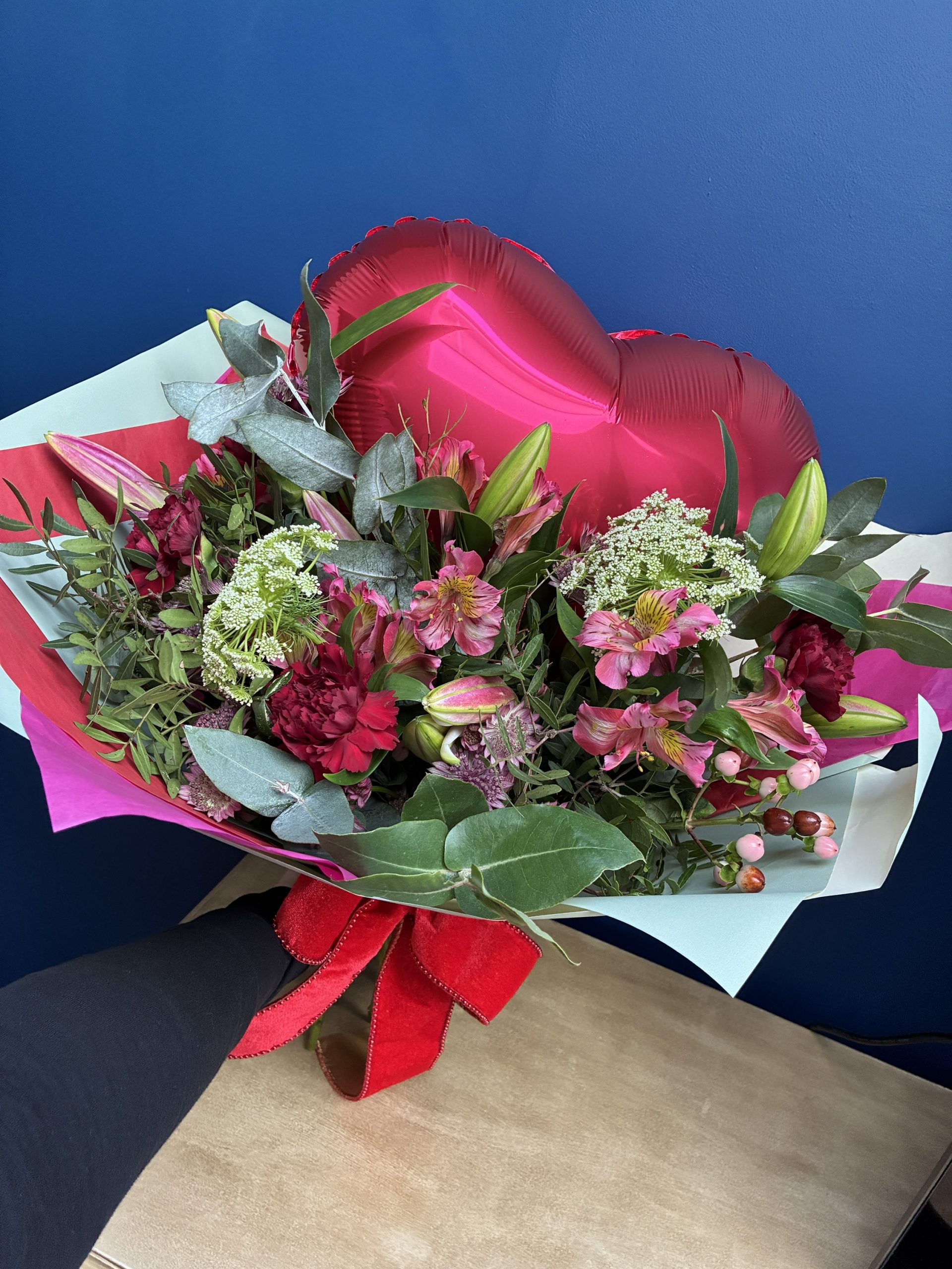 Mixed flower bouquet with red foil heart balloon integrated and wrapped in tissue and craft paper, creating an unusual 2 in 1 gift.
