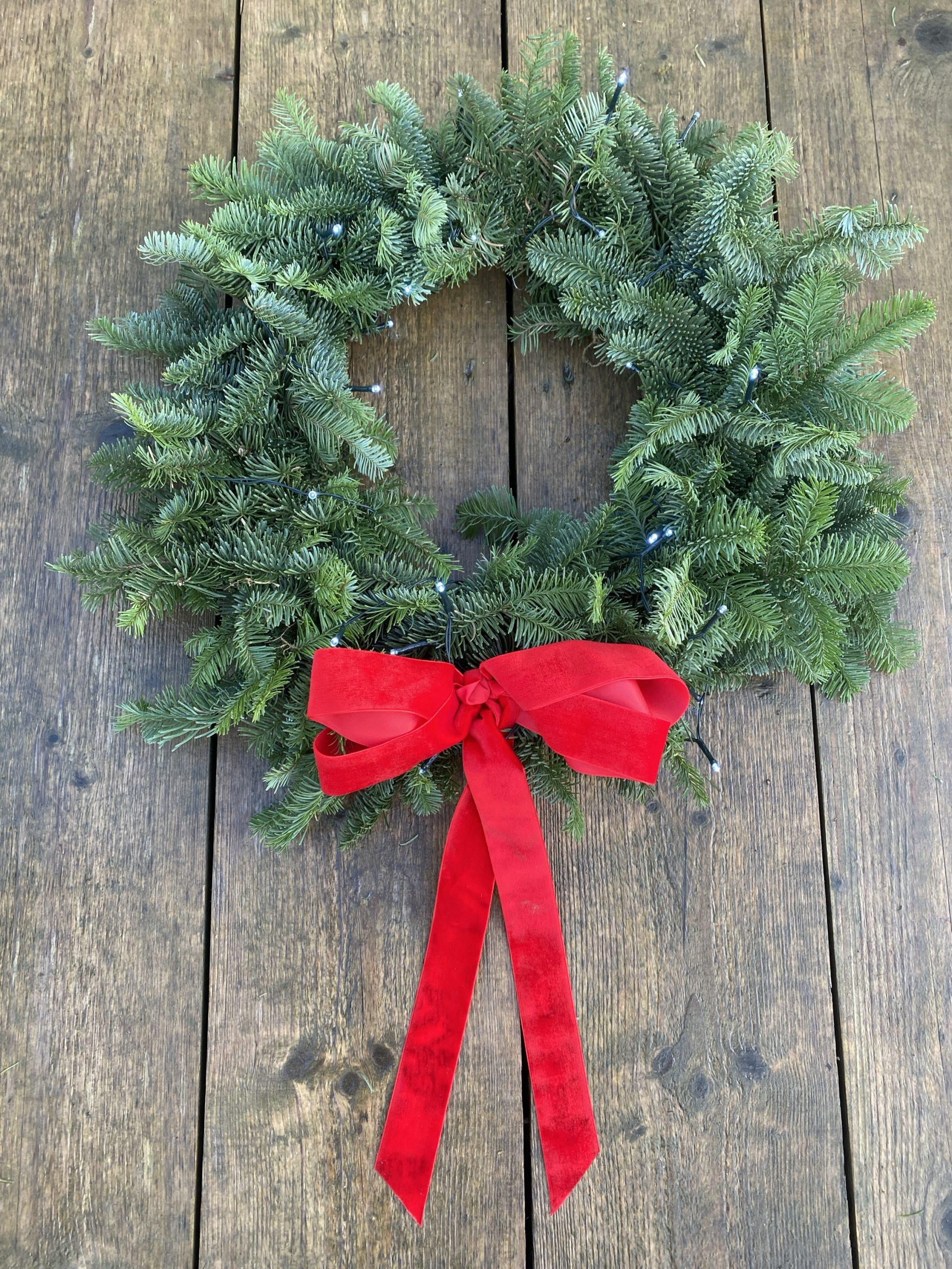 A fully spruce wreath with a velvet red bow and outdoor lights.
