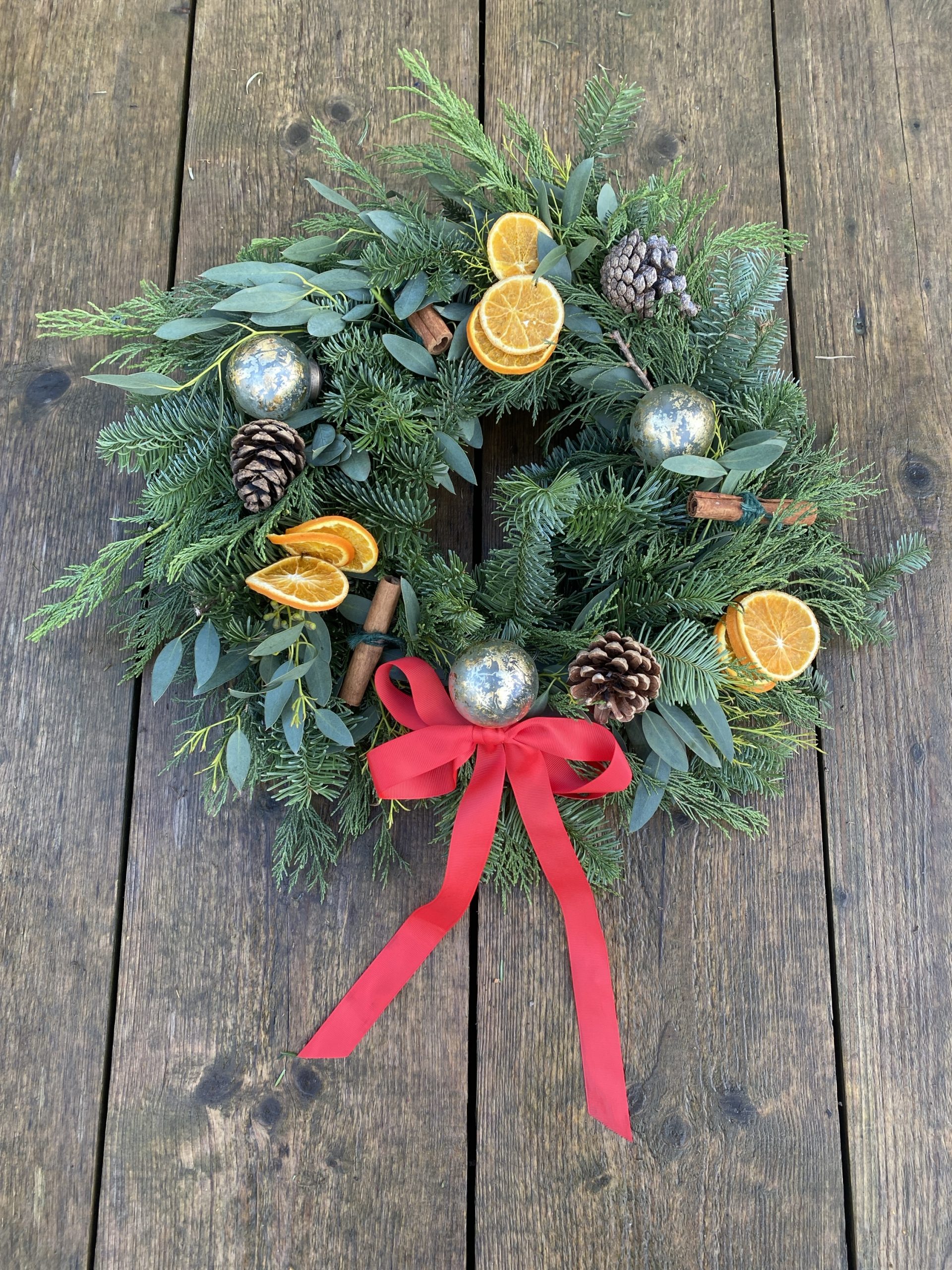 Spruce and mixed foliage wreath with cones, oranges, glass baubles and cinnamon sticks.